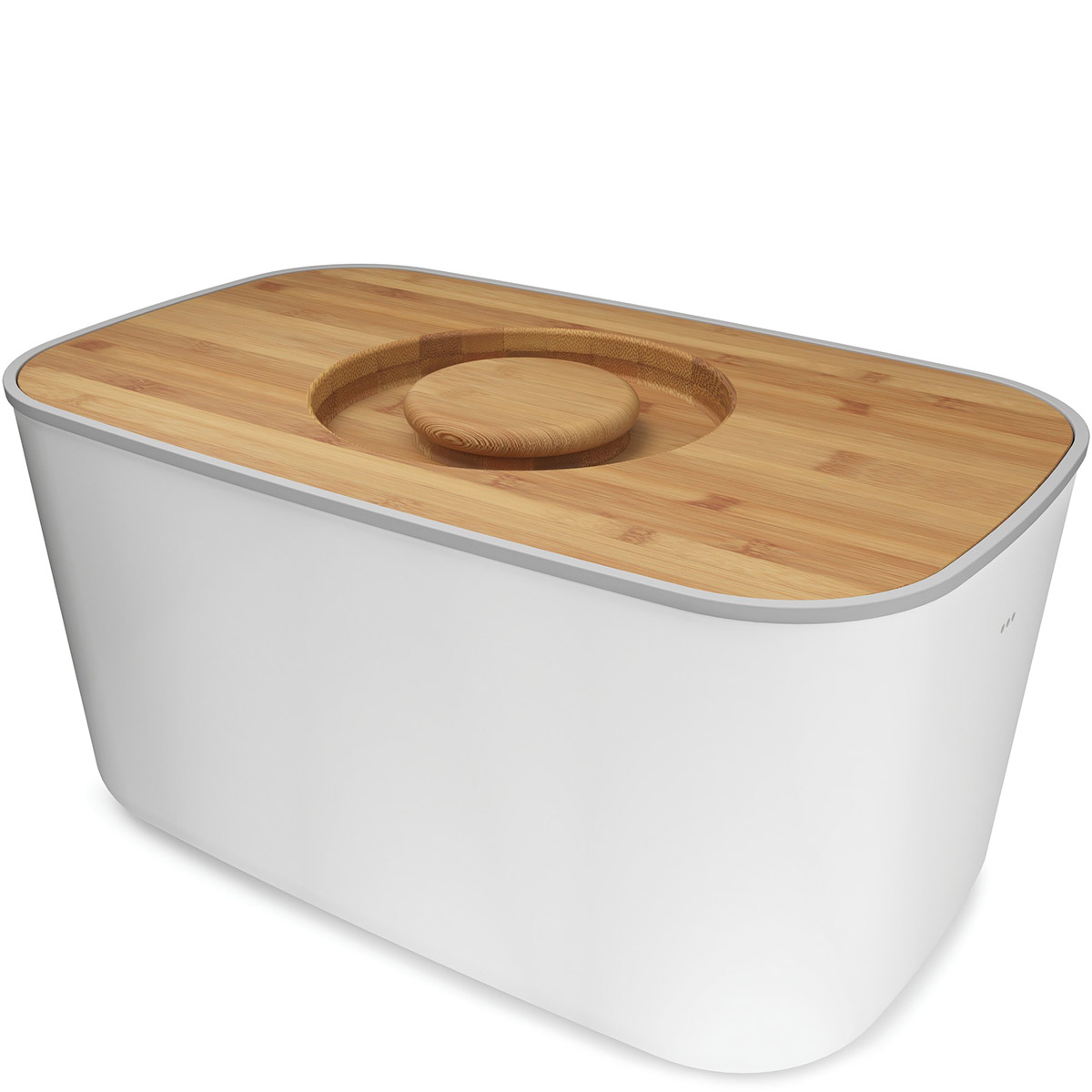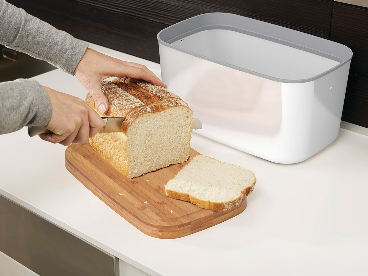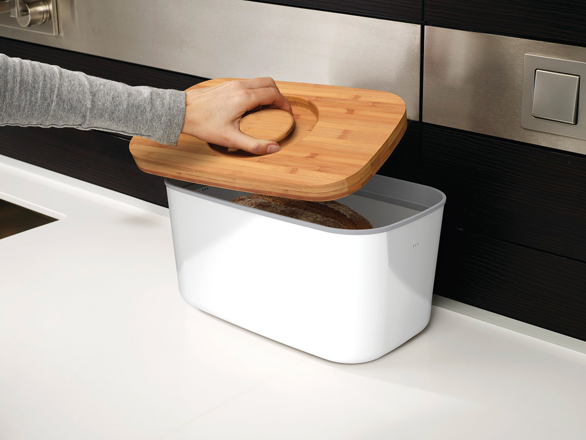 Chlebak z bambusową deską do krojenia marki Joseph Joseph, to pojemnik o delikatnych krągłościach. Wykonany został ze stali nierdzewnej malowanej proszkowo na kolor biały, a jego pokrywa z bambusa. Pokrywa po odwróceniu służy również jako deska do krojenia pieczywa. Kształt pojemnika z lekko rozszerzoną jego górną częścią pozwala na przechowywanie większej ilości pieczywa.
