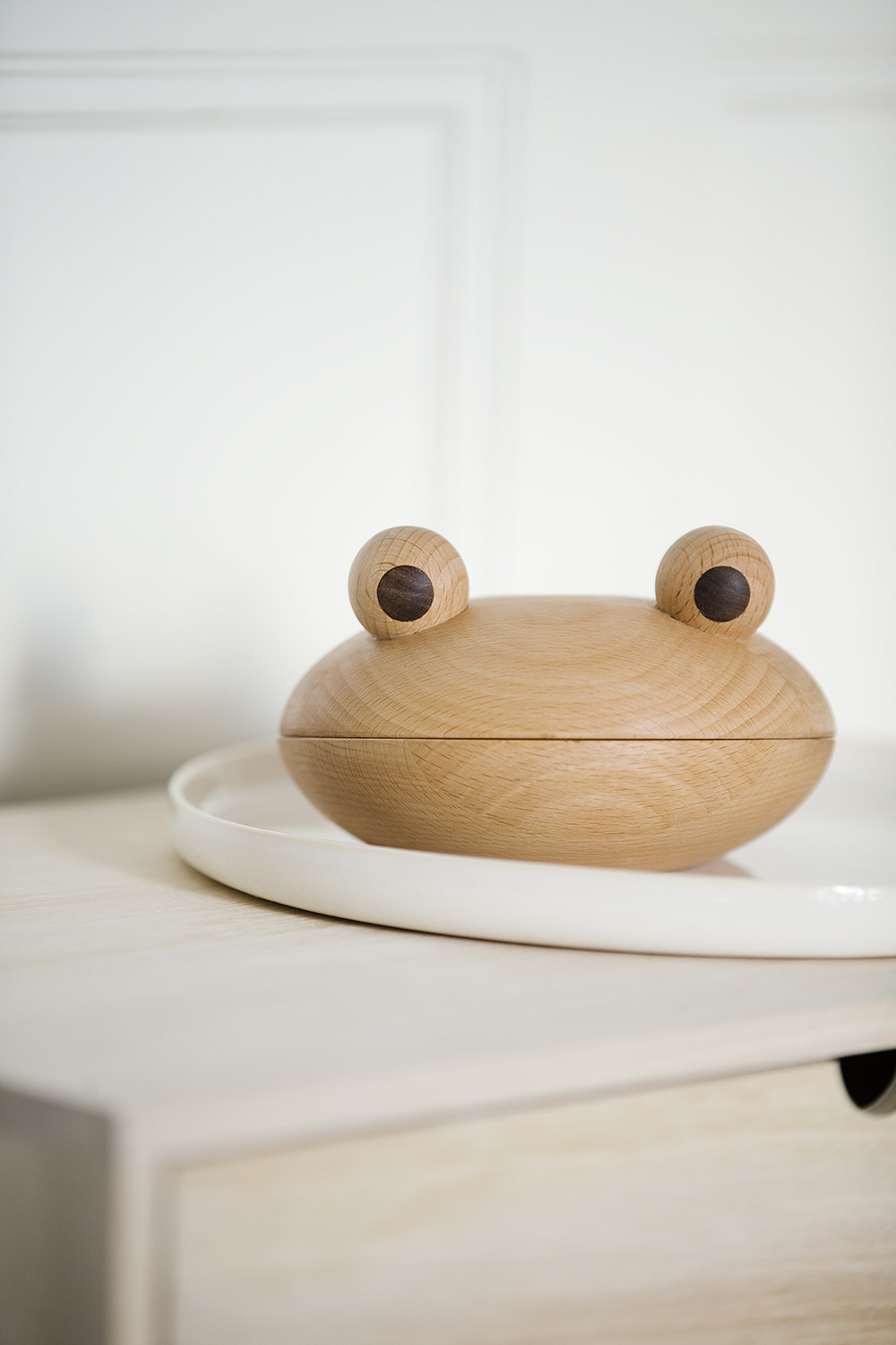 Szkatułka z pokrywką Żaba Spring Copenhagen. Frog Bowl to zabawna i dekoracyjna miska wykonana z drewna bukowego i orzecha włoskiego. Głowa żaby może się obracać, więc zmienia swój nastrój w zależności od tego, jak góra i dół są pod kątem względem siebie. Misa, która może zmienić swój nastrój. Ideą projektu było stworzenie miski, którą można umieścić w salonie lub na stole w kuchni. Oprócz funkcji misy, ma to być również element projektu, z którym można grać. Frog Bowl to bajeczna postać tworząca miejsce na małe radości życia.