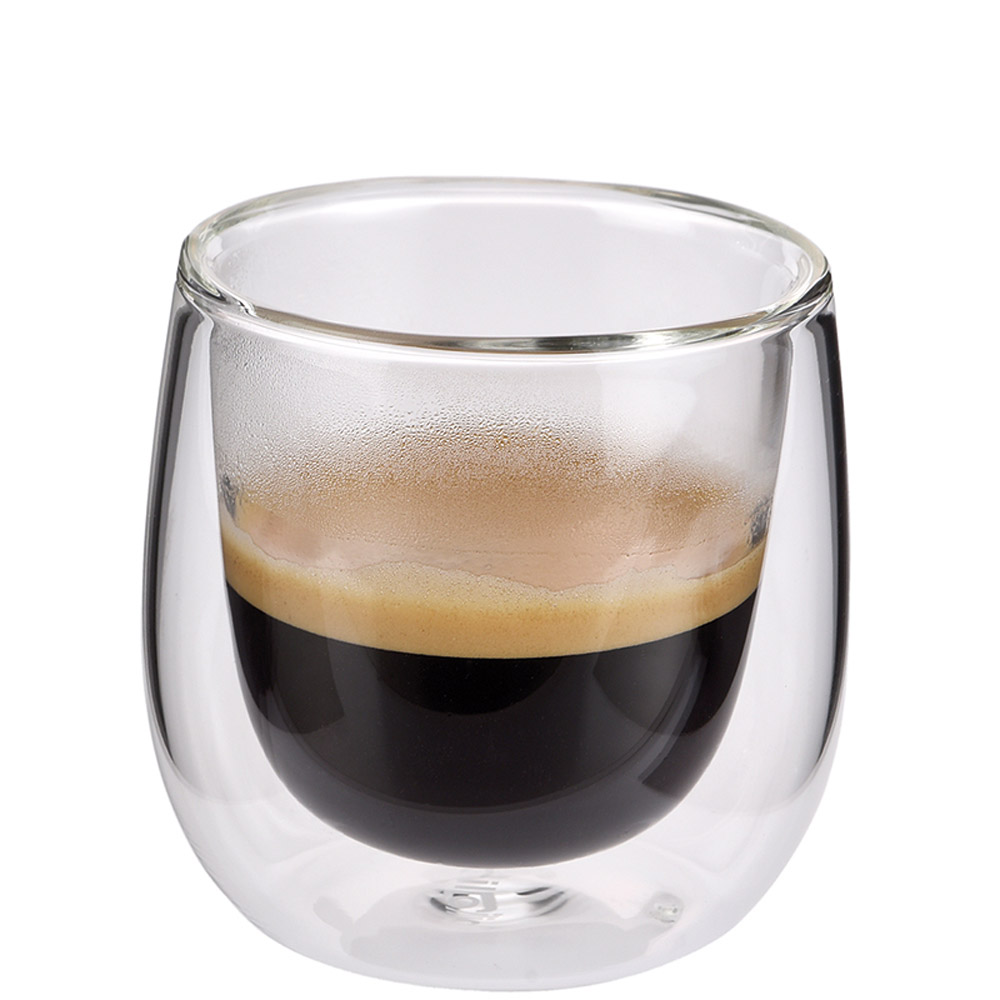 Szklanki do kawy espresso podwójne ścianki Verona Cilio - 2 sztuki - idealne do gorącej porcji kawy. Zestaw dwóch szklanek o podwójnych ściankach, wykonanych z wytrzymałego i odpornego na temperatury szkła borokrzemowego. Podwójne ścianki chronią dłonie przed wysoką temperaturą i spowalniają stygnięcie czarnej, mocnej kawy espresso.