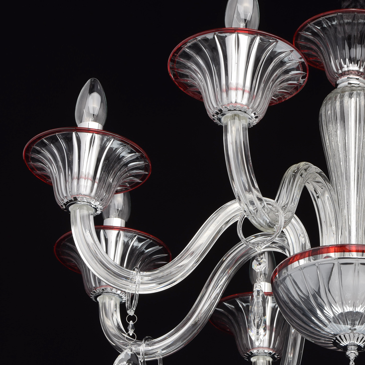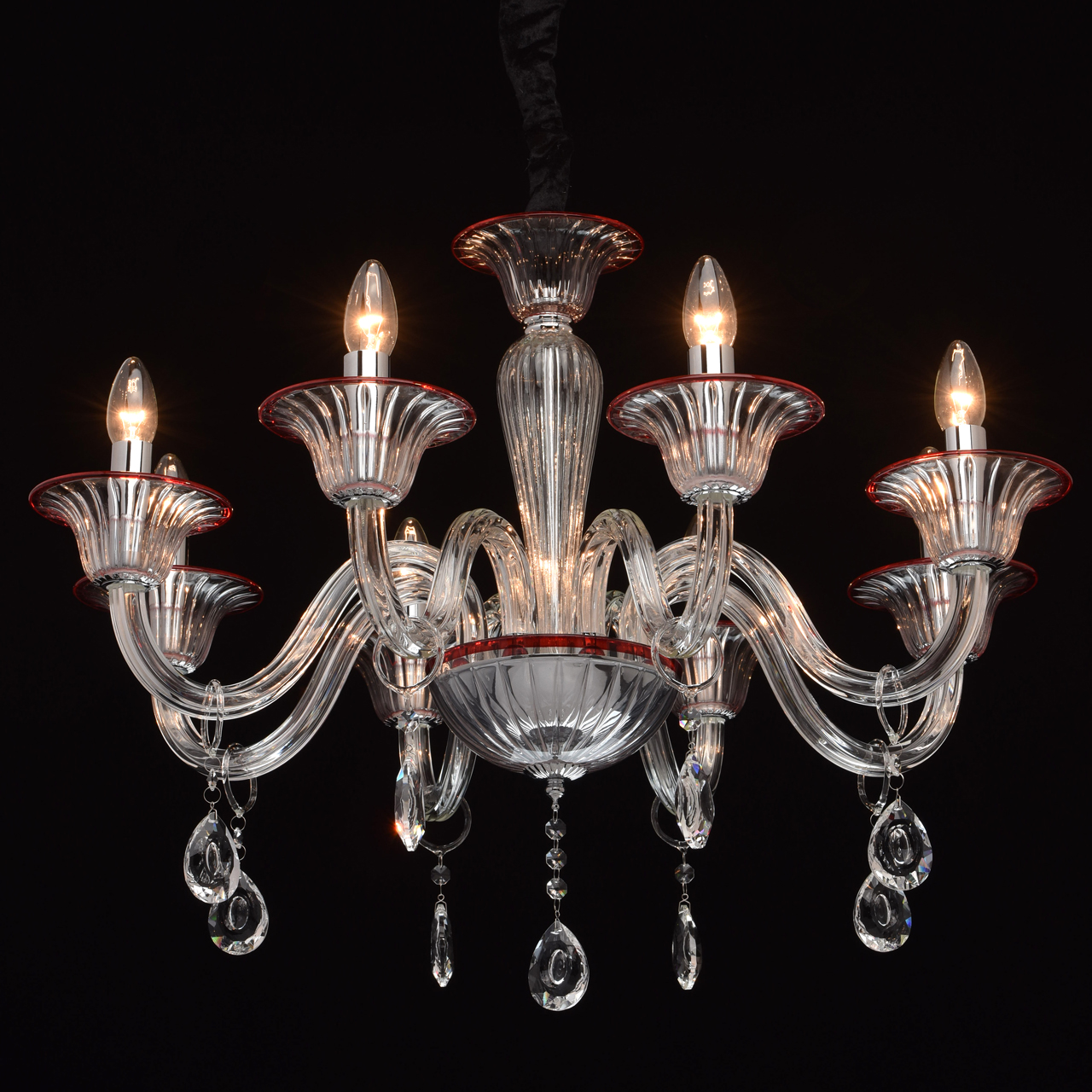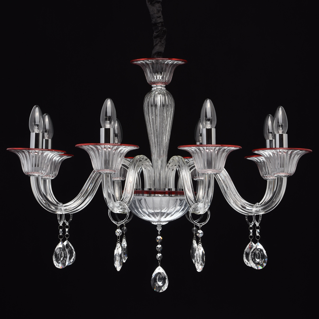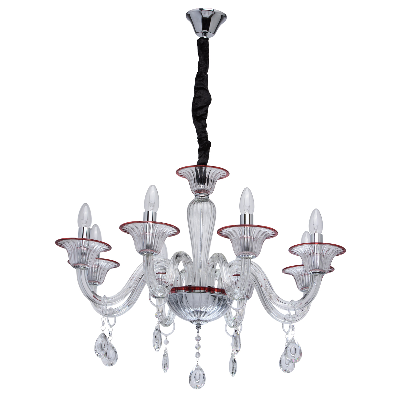 Szklany, 8-ramienny żyrandol z czerwonymi wykończeniami MW-LIGHT Elegance.