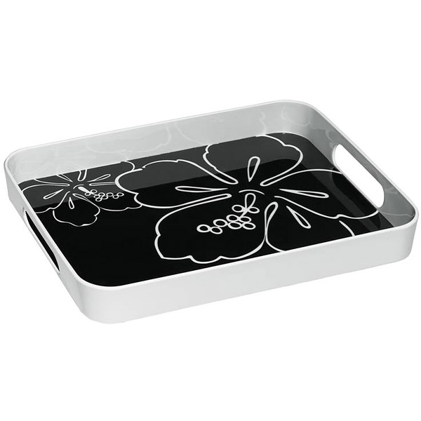 Duża taca w kolorze białym z czarnym kwiatowym wzorem, wykonana z melaminy, która jest materiałem bardzo twardym i odpornym na zarysowania, dzięki czemu przez wiele lat użytkowania zachowa świeży wygląd i piękny połysk. Wysokie ścianki boczne z uchwytami zapewniają bezpiecznie przenoszenie różnych przedmiotów.