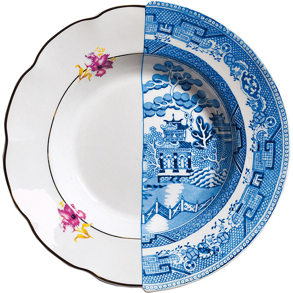 Głeboki talerz porcelanowy z ekskluzywnej kolekcji Hybrid włoskiej marki Seletti. Kolekcja zaprojektowana została przez CtrLZak Art Studio i stanowi gratkę dla miłośników oryginalnego designu na najwyższym światowym poziomie. Seletti Hybrid to zastawa stołowa, która jest połączeniem historii produkcji porcelany kostnej w Chinach i Europie. Produkty tej serii składają się z dwóch różnych wzorów symbolizujących dalekowschodnią i zachodnią estetykę oraz ukazujące motywy popularne w poszczególnych kulturach. Kolekcja ta wytwarzana jest ręcznie w światowej stolicy porcelany kostnej – Tangshan. Ten rodzaj porcelany opracowany został pod Koniec XVIII wieku przez angielskiego garncarza Thomasa Frye. Jej skład to popiół kostny, skalenie oraz kaolin, co powoduje, że charakteryzuje się wysokim poziomem bieli i przezroczystości oraz wytrzymałością mechaniczną, której nie ma klasyczna porcelana.