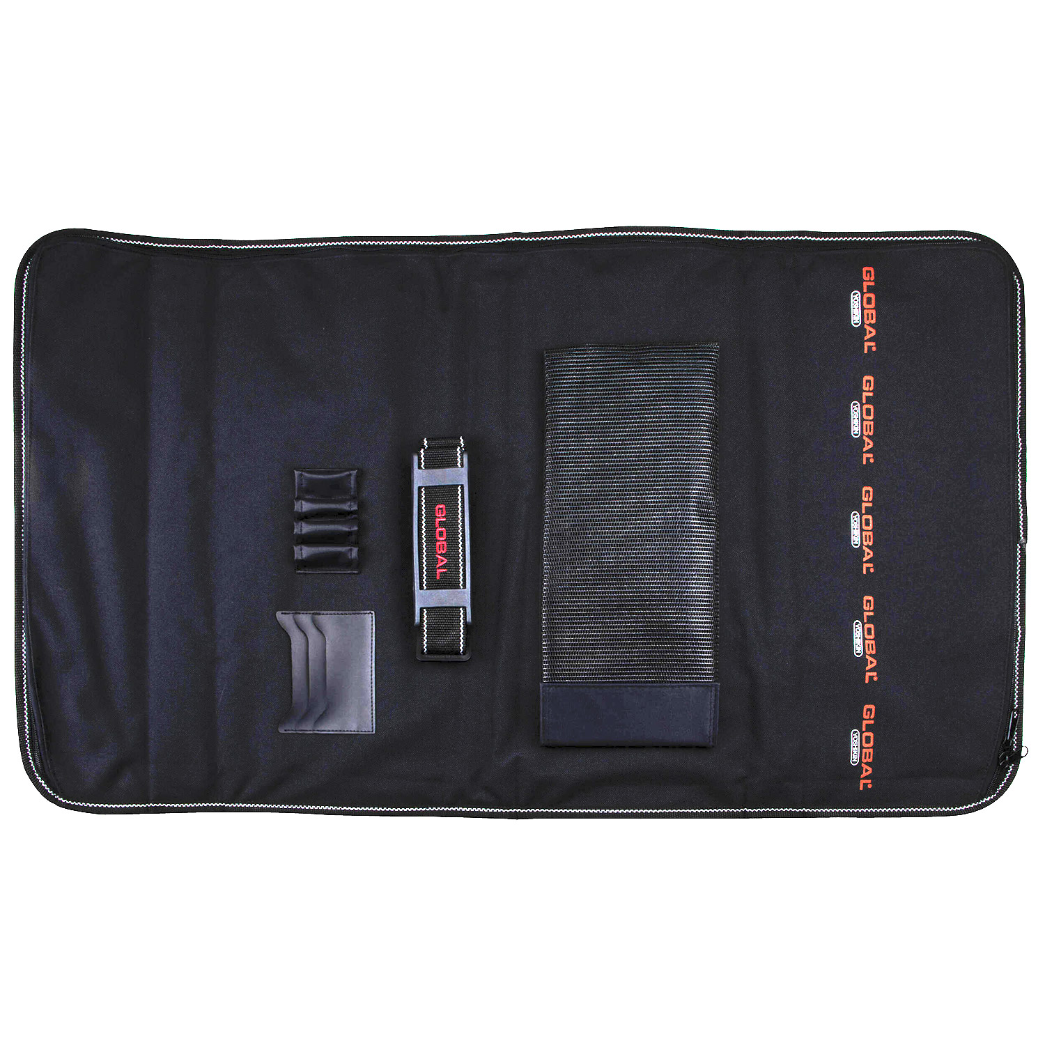 Torba szefa kuchni na 21 noży Global. Usztywniona, składana torba z solidnego nylonu, w której można bezpiecznie przewozić i przechowywać noże kuchenne Global. Wyposażono ją w wygodną rączkę i doczepiany pasek. Torba jest zapinana na klamry i posiada kieszenie na różnej wielkości noże oraz przestrzeń na dodatkowe akcesoria. Komora z nożami zapinana jest w całości na zamek błyskawiczny.
