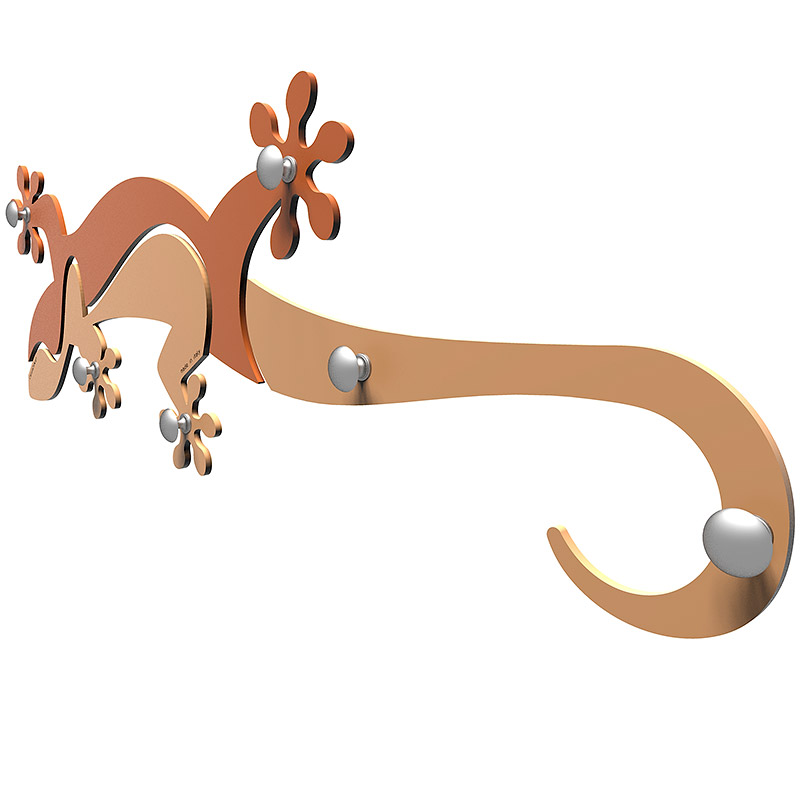 Wieszak ścienny Gecko włoskiej marki Callea Design. Na tle o kształcie gekona umieszczonych zostało sześć dużych wieszaków. Zaprojektowany i wyprodukowany we Włoszech w zakładach CalleaDesign. Przed opuszczeniem fabryki wieszak został dokładnie sprawdzony. Materiał, z którego został wykonany to włókno drzewne, które ma doskonałą jednorodność oraz jest łatwe w obróbce, która pozwala na uzyskanie wysokiej jakości wykończenia. Malowanie odbywa się farbami wodnymi z satynową powierzchnią. Do wieszaka dołączony jest zestaw montażowy.