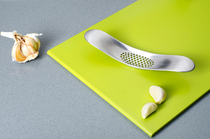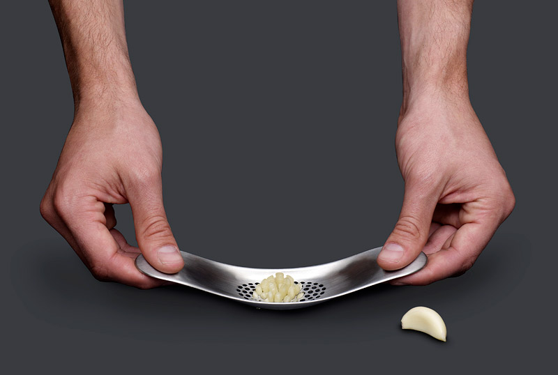 Wyciskacz do czosnku Rocker z ekskluzywnej kolekcji linii 100 Collection, wykonany w całości ze stali nierdzewnej. Zaprojektowany i wyprodukowany przez brytyjską firmę Joseph Joseph. Kołyszący ruch wyciskacza ułatwia rozgniatanie czosnku na powierzchni roboczej. Czosnek przeciśnięty przez zaostrzone sitko, pozostaje na zaokrąglonej, wewnętrznej powierzchni wyciskacza, skąd za pomocą łyżeczki lub noża można go wygodnie wrzucić do naczynia.