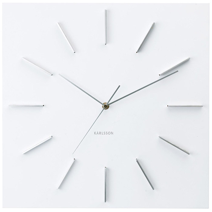 Kwadratowy zegar ścienny Delicate Square marki Karlsson, którego oznaczenia godzin oraz wskazówki są niezwykle drobne. Lekki wygląd cyferblatu z cienkim oznaczeniem cyfr oraz klasyczne, proste, minimalistyczne wskazówki tworzą niezwykły zegar, który będzie ładnie się prezentował w każdym pomieszczeniu. Zegar wyposażony jest w tzw. płynący, niezwykle cichy mechanizm.