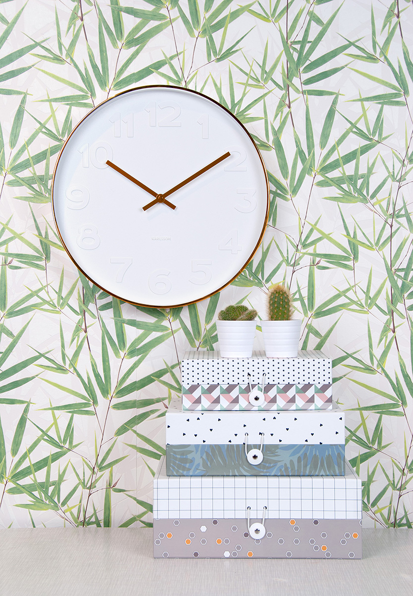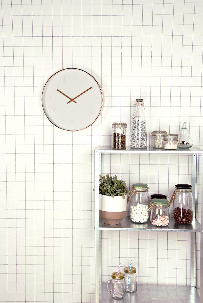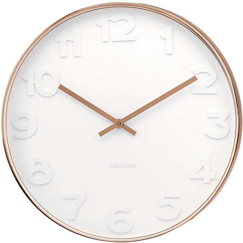 Niezwykle elegancki zegar ścienny Mr. White, zaprojektowany dla firmy Karlsson przez zespół projektantów BOX32 Design. Biała tarcza zegara umieszczona została w metalowej obudowie o miedzianym, polerowanym wykończeniu. Na tarczy widnieją duże, białe cyfry oznaczające poszczególne godziny. Z uwagi na to, że zarówno cyferblat jak i cyry są białe, odczyt godziny może być utrudniony w mocno oświetlonych pomieszczeniach. Metalowe, proste wskazówki dodają mu szyku, elegancji i klasy.