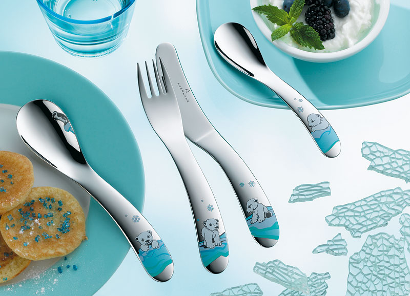 Zestaw naczyń i sztućców dla dzieci ICE BEAR marki Auerhahn to idealny zestaw dla naszych pociech. Naczynia zostały wykonane z wysokiej jakości porcelany, natomiast sztućce ze stali nierdzewnej. Zestaw ozdobiony został motywem zimowym, biały niedźwiadek i pingwin sprawią pociechom dużo radości. Każde dziecko będzie chętniej piło i jadło korzystając z takiego kompletu naczyń i sztućców. W skład zestawu wchodzi talerzyk, miseczka, kubeczek oraz sztućce (łyżka, łyżeczka, widelec i nożyk). Sztućce są tak wykonane, aby były w pełni bezpieczne dla dzieci. Zestaw można bez obaw myć w zmywarce.