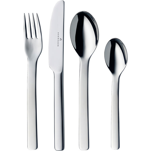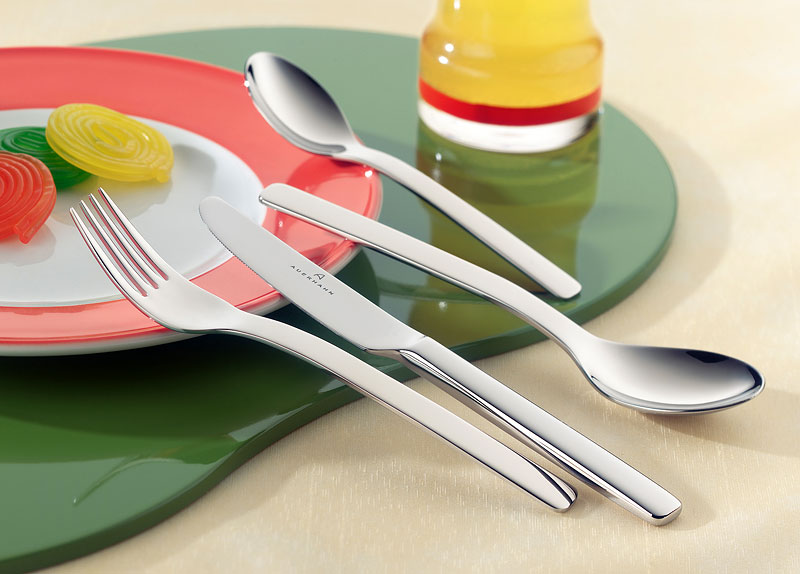 Zestaw sztućców dla dzieci PURE marki Auerhahn wykonany został z wysokiej jakości polerowanej stali nierdzewnej. Sztućce mają prosty kształt i nie są ozdobione, dzięki czemu będą pasowały w każdym domu i do każdej zastawy stołowej. Na stole w jadalnie będą bardzo elegancko wyglądały. Są idealne do nowoczesnych wnętrz i dekoracji. W skład zestawu wchodzi łyżka, łyżeczka, widelec i nożyk. Można je bez obaw myć w zmywarce