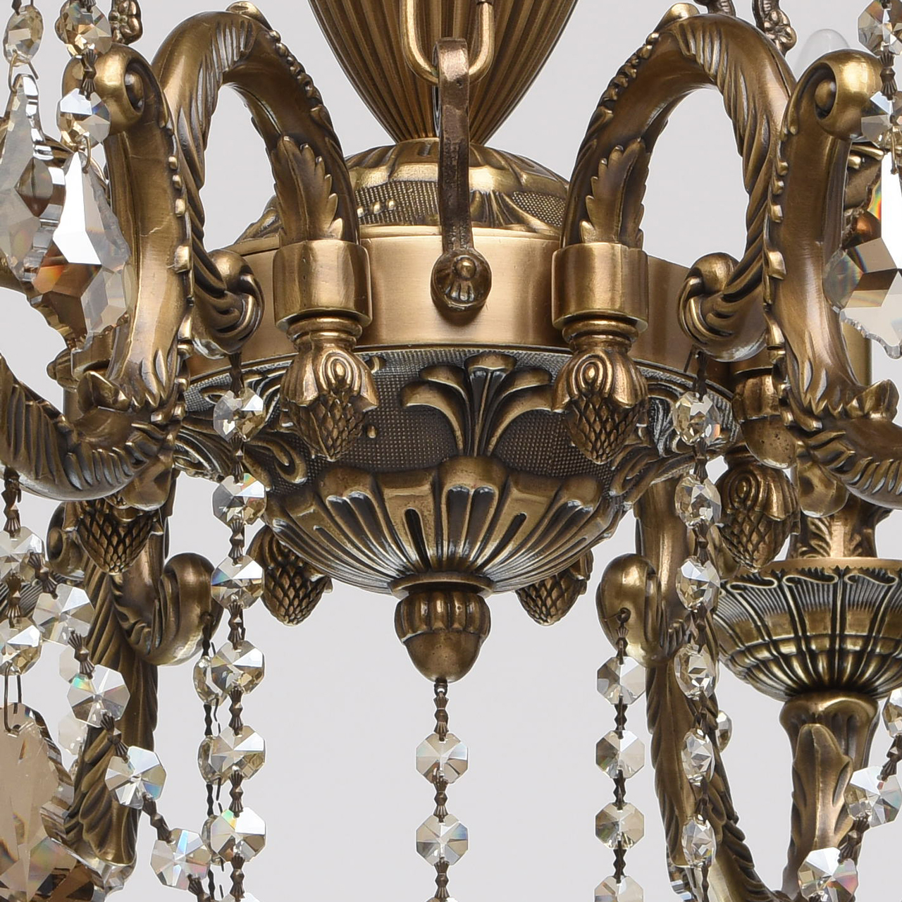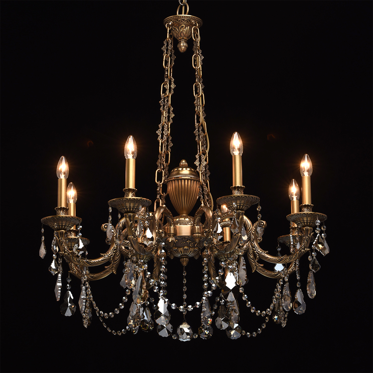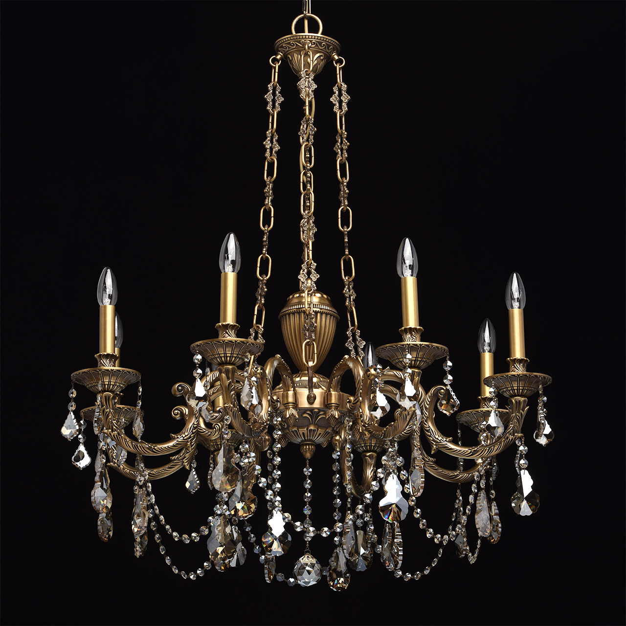 Żyrandol 8-ramienny z mosiądzu i kryształy z topazu CHIARO Classic. Klasyczny żyrandol Gabriel wyróżnia się wysokim poziomem wydajności i materiałami o specjalnej jakości. Podstawa w kolorze antycznego brązu wykonana jest z mosiądzu, dzięki czemu mogła ozdobić lampę licznymi detalami, zagięciami, ornamentami! Wiszący łańcuch ma ciekawe, wzorzyste ogniwa charakterystyczne dla wnętrz pałacowych. Szlachetne, kryształowe wisiorki z galwanizowaną obróbką w kolorze topazu, dodają eleganckich akcentów wizerunkowi lampy Gabriel, gdzie światło i blask łączą się w harmonijny związek! Niezwykły design, drogi wystrój. Bardzo wysoka jakość wykonania - podstawa lampy wykonana jest z brązu, wystrój wykorzystuje wysokiej jakości kryształ. Wyjątkowa dekoracja ramion wykonana jest w formie artystycznego tłoczenia. Model prezentowany jest w kilku wariantach - może uzyskać kompleksowe oświetlenie przestrzeni. Z czasem wartość modelu wzrośnie, ponieważ przy produkcji stosowany jest niezawodny i trwały metal - brąz.
