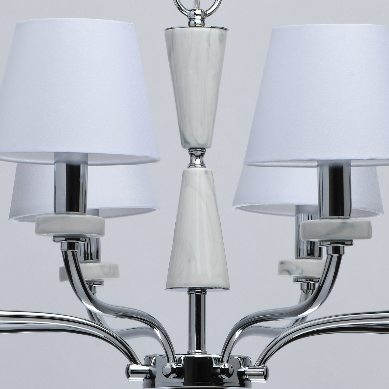 Żyrandol białe klosze, chrom, marmurowe ozdobniki Vitalina MW-LIGHT Elegance. Podstawa wykonana jest z metalu i ocynkowana w kolorze chromu. Ozdobiona jest białymi kloszami tekstylnymi z żaroodpornym akrylem w środku. Abażury są zszywane i obszyte obrzeżem. Dekoracyjne rozety i dekoracje środkowej osi wykonane są z porcelany szkliwionej z malowaniem imitującym marmur.
