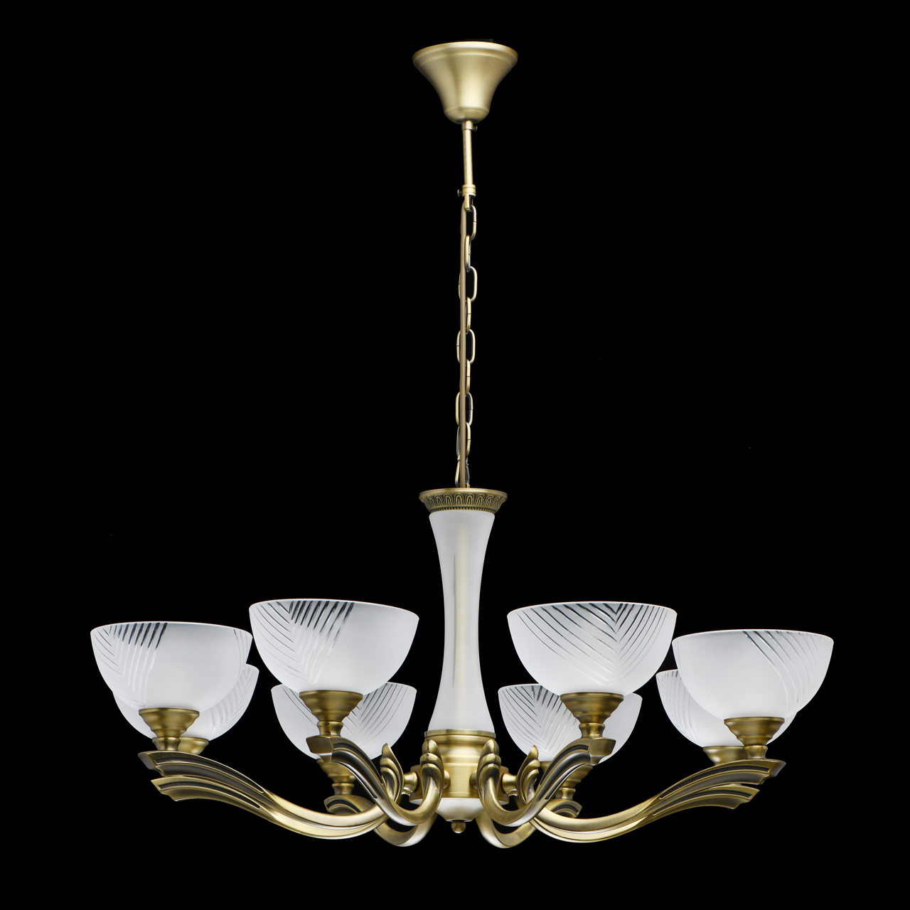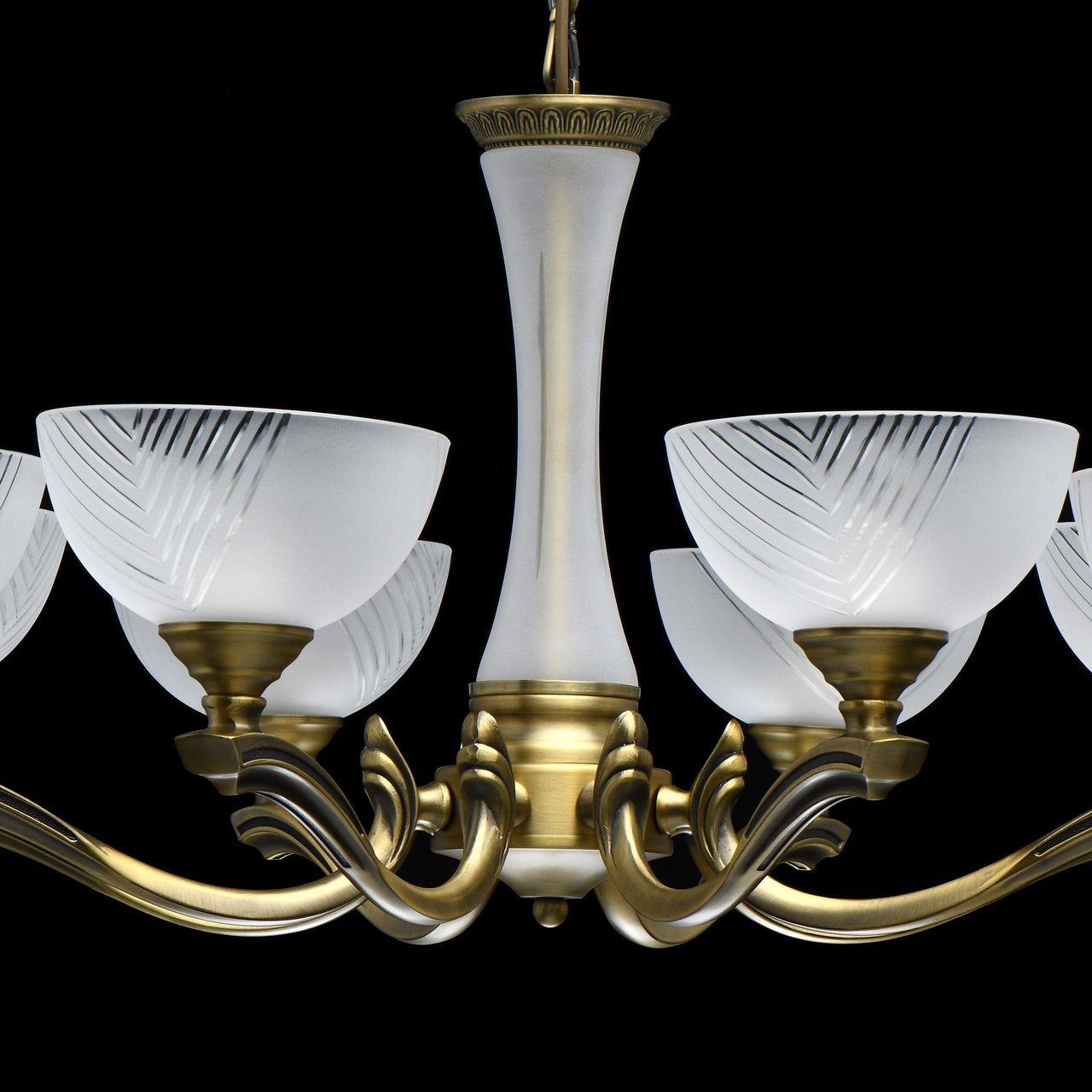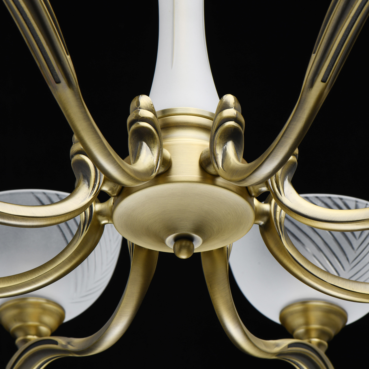 Żyrandol mosiężny ze szklanymi kloszami Aphrodite MW-LIGHT Classic. Klasyczna forma żyrandola wykonana jest ze szlachetnego mosiądzu. Elegancki, szklany dekor na osi środkowej. Szklane, matowe klosze delikatnie rozpraszają światło. Możliwość regulacji wysokości lampy dzięki ogniwom łańcucha.